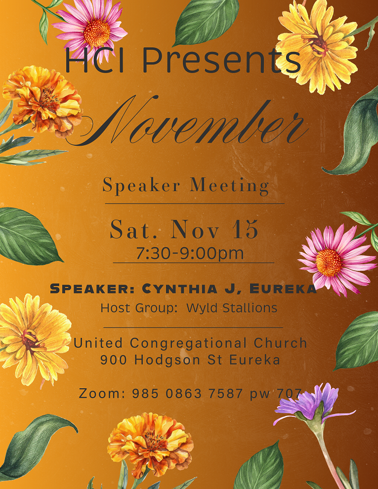 HCI (Humboldt County Intergroup) meets the first Monday of the month at 6:30 PM, by Zoom 835 8865 1778 – password is 707 . HCI serves the groups in Humboldt County by providing the Answering Service and its volunteers (there is no central office), the newspaper ad, the monthly Speaker Meetings, and the North Coast Unity publication, as well as AA social & informative events.